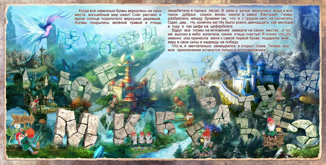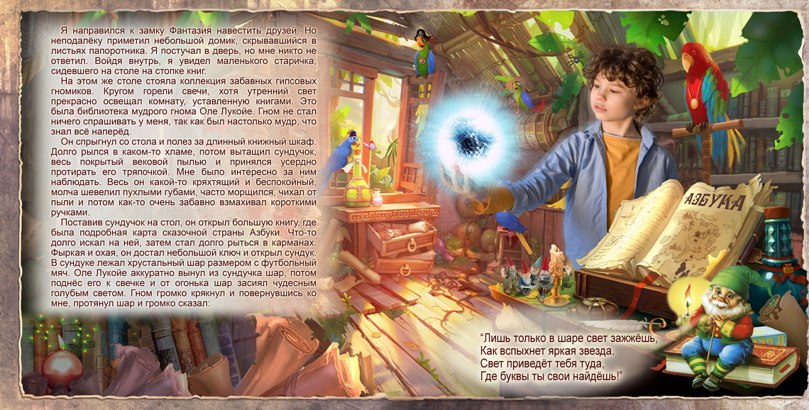 Брошюру-образец можно купить или бесплатно скачать здесь. Кроме пронумерованных разворотов она содержит информацию для подготовительного этапа создания фотокниги-сказки.